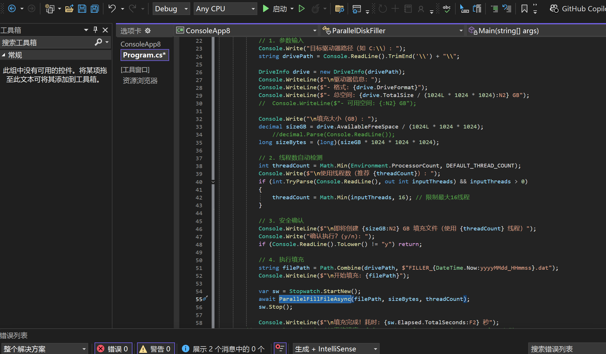 « C# 基于异步实现快速填充磁盘剩余空间 admin 发布于 2025-10-18 23:49 阅读:50 C# 通过网盘分享的文件:ConsoleApp8.zip 链接: https://pan.baidu.com/s/19o6PG5lJPMXpZgUcTaTQzA?pwd=wqv8 提取码: wqv8